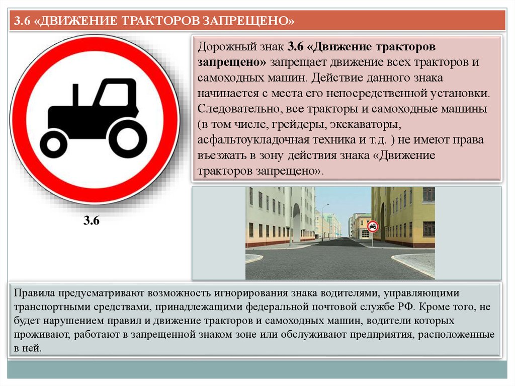 ПДД: Запрещающий дорожный знак 3.6 Движение тракторов запрещено в Правилах дорожного движения Суть: Дорожный знак 3.6 Движение тракторов запрещает движение тракторов и самоходных машин. Кроме тех, что обслуживают предприятия и граждан, проживающих у знака. Текст ПДД 2015: Запрещающий дорожный знак 3.6 Движение тракторов запрещено в Приложении 1 к ПДД