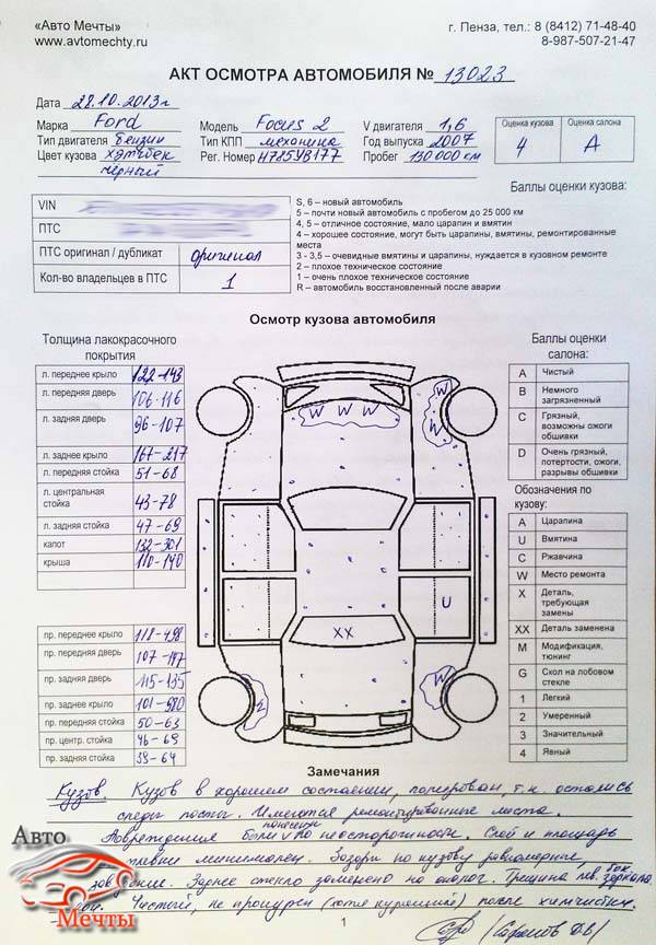 Далее по ходу проверяются переднее правое крыло, колесо и двери (или одна правая дверь, если конструкция кузова двухдверная). Сзади автомобиля проверяются крышка багажника или дверь задка кузова, работа замка багажника, задний бампер, приборы освещения и сигнализации, состояние багажного отсека. Заканчивается осмотр проверкой задней левой двери (если имеется). При оформлении документации на прием автомобиля в ремонт составляется акт комплектности автомобиля, где отмечаются результаты наружного осмотра автомобиля, техническое состояние узлов, агрегатов, деталей и комплектности в пределах соответствия заводской инструкции по эксплуатации данной модели автомобиля, а также недостающие детали.