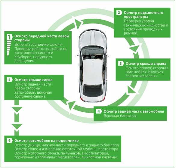 Технологический процесс внешнего осмотра автомобиля при его приеме на СТО начинается с левой передней двери водителя, где проверяется работа замка двери, стеклоподъемника, петель двери, ограничителя открывания двери, состояние обивки, затем проверяются звуковой сигнал, приборы освещения и сигнализации на панели приборов, у рулевой колонки и в салоне автомобиля, люфт рулевого колеса, педали управления, ремни безопасности, салон автомобиля и механизмы регулировки положения сидений.
