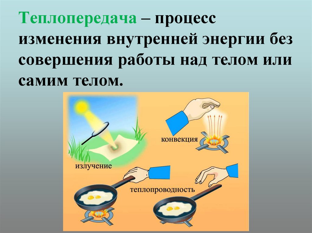 Примеры теплопередачи в этом случае можно привести следующие: держась за металлическую пластину, другой конец которой будет помещен над пламенем свечи, со временем можно почувствовать жжение и боль, а в момент прикосновения к железной ручке кастрюли с кипящей водой можно получить ожог.