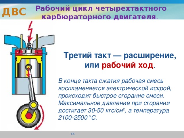 - Третий такт — расширение; происходит возгорание сдавленной горючей смеси от свечи зажигания. Смесь сжигается достаточно быстро при неизменном объеме, который соответствует объему самой камеры сжатия. Это основная характерность работы карбюраторного двигателя. При перегорании формируются газы, которые двигают поршень книзу и передают движение коленвалу.