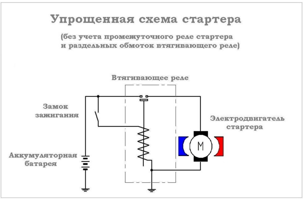 При повороте ключа зажигания на стартер подается питание, и электромагнит внутри корпуса срабатывает.