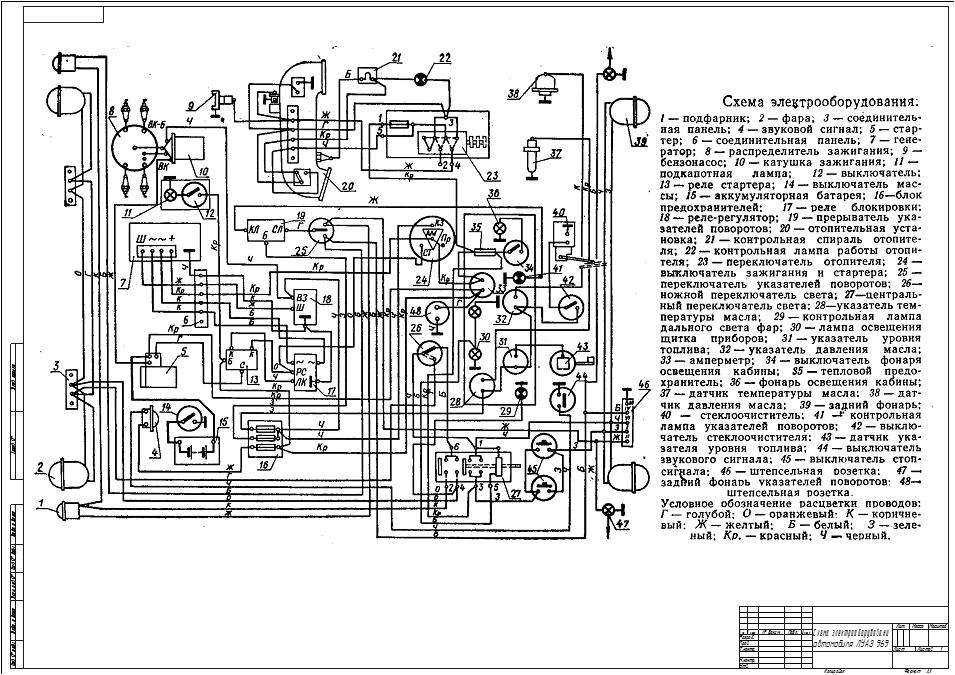 1 — реле-регулятор, 2 — генератор, 3 — амперметр, 4 — аккумуляторная батарея, 5 — реле стартера, 6 — стартер СТ130-А1, 7 — замок зажигания, 8 — сопротивление добавочное, 9— катушка зажигания, 10— коммутатор транзисторный, 11 — распределитель, 12 — свеча зажигания, 13 — блок биметаллических предохранителей, 14 — переключатель электродвигателя отопителя, 15 — сопротивление электродвигателя отопителя, 16 — электродвигатель отопителя, 17 — реле-прерыватель указателей поворота, 18 — фонарь контрольной лампы, 19 — фонарь контрольной лампы аварийного перегрева воды, 20 — датчик температуры, 21 — указатель уровня топлива, 22 — датчик указателя уровня топлива, 23 — указатель температуры воды, 24 — датчик указателя температуры воды, 25— фонарь контрольной лампы аварийного падения давления масла, 26-—контакт манометра, 27— переключатель указателей поворота, 28 — выключатель сигнала торможения, 29, 30 — фонари задние, 31—подфарник, 32 — фара, 33 — переключатель света, 34 — фонарь подкапотный, 35 — выключатель плафона, 36 — плафон, 37 — переключатель света ножной, 38 — патрон контрольной лампы дальнего света фар, 39 — патроны ламп освещения приборов, 40 — предохранитель биметаллический, 41 — розетка штепсельная, 42—сигнал звуковой, 43 — кнопка звукового сигнала (входит в комплект рулевой колонки), 44 — розетка штепсельная, 45 — фонарь повторителя указателя поворота
