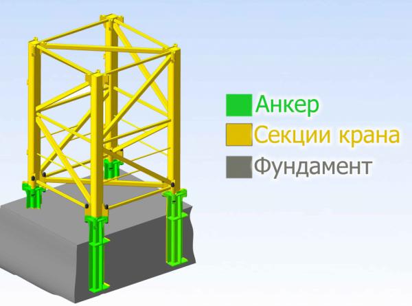 Рамы и монтажная обойма соединены друг с другом тягами, расположенными по периметру рам и монтажной обоймы крана параллельно башни, при этом тяги шарнирно связаны с рамами, а между рамами и монтажной обоймой по высоте образованы зазоры.