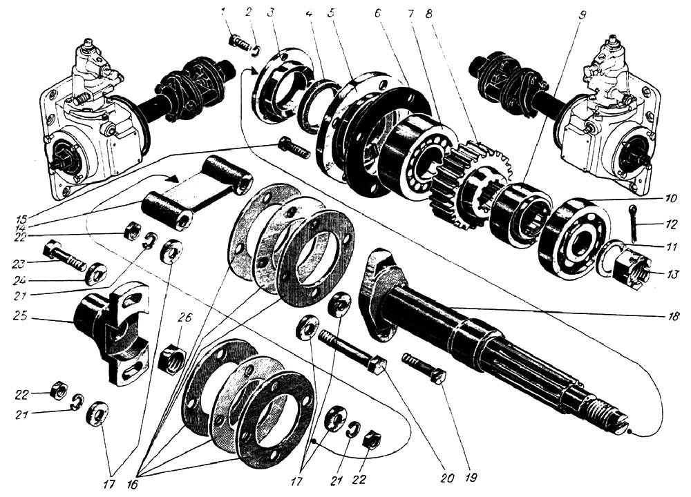Ведущая полумуфта своими шипами через текстолитовую шайбу соединена с ведущей шестерней привода.