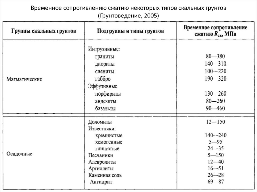 Количественной характеристикой прочности скальных грунтов является предел прочности на одноосное сжатие Rc, определяемый раздавливанием образца грунта и вычисляемый по формуле