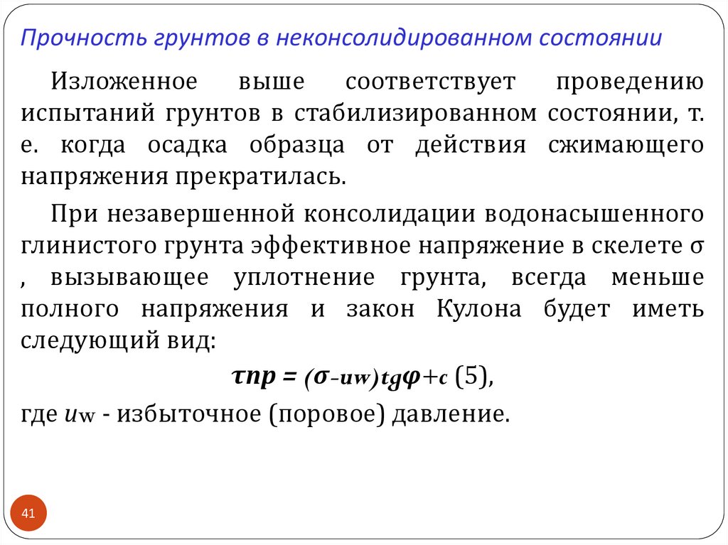Значения φ и с, полученные по методике медленного консолидированного среза, используются для определения расчетного сопротивления грунта, а также для оценки несущей способности основания, находящегося в стабилизированном состоянии (все напряжения от внешней нагрузки восприняты скелетом грунта).