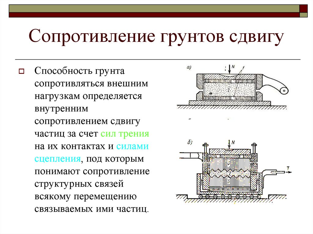 Они зависят от влажности и химического состава. Разрушение грунтов наблюдается при сдвиге, когда в образце возникают значительные касательные напряжения. Этим напряжениям противостоят силы трения отдельных частиц и сцепления.
