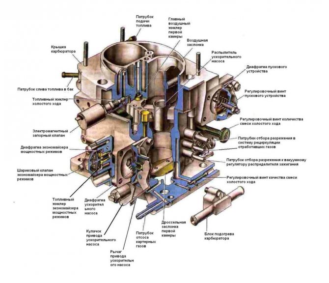 Простейший карбюратор состоит из следующих частей: поплавковой камеры с поплавком и игольчатым клапаном; дозирующего устройства с жиклером и распылителем; смесительной камеры с диффузором, дроссельной заслонкой и воздушной заслонкой. Смесительная камера карбюратора соединяется с впускным трубопроводом двигателя.