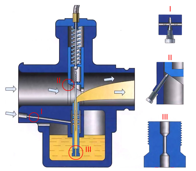 Во избежание перелива топлива из форсунки конец основной форсунки держится немного выше уровня топлива в поплавковой камере. Эта разница уровней между концом основной форсунки и уровнем топлива в поплавковой камере называется кромкой форсунки. Вы можете увидеть уровень кромки сопла на диаграмме выше.