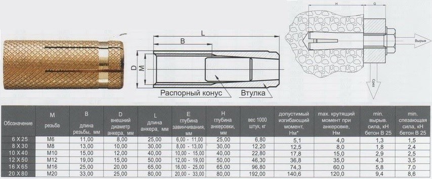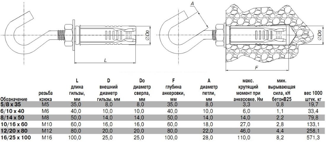 - Съемного, на его стержне с одного конца нарезана резьба. Другим наконечником, с помощью крепления он держит груз в бетонном растворе зафиксированный плитой. Его используют строители зданий разных предназначений в сооружениях из железобетона, кирпича, камня.