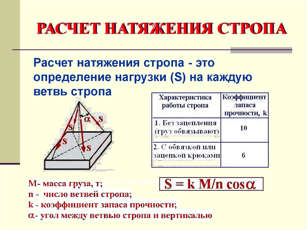 - S – это максимальная нагрузка на каждую ветку стропа;