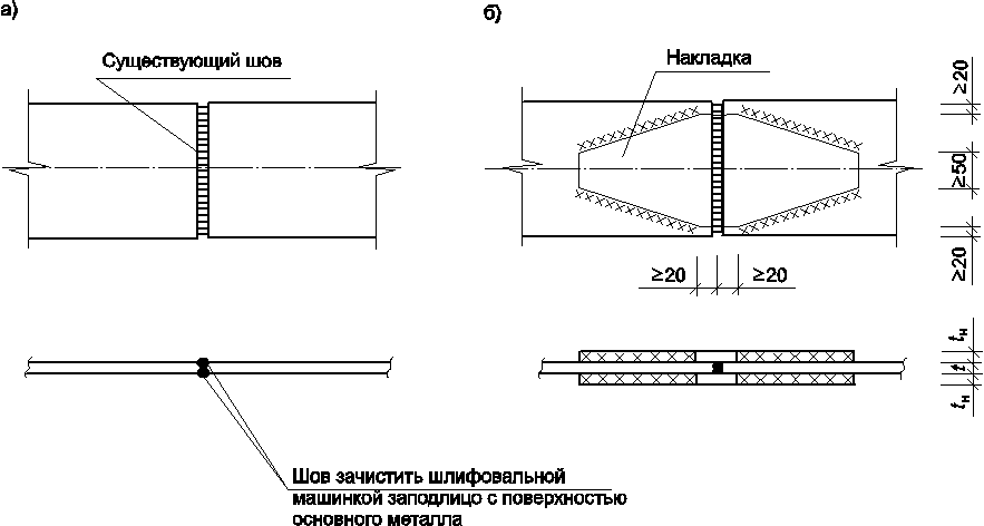 Усиление растянутых стыковых швов накладками или косыми вставками трудоемко и поэтому не рекомендуется. Кроме того, накладки концентрируют напряжения и в соединениях, работающих при динамических нагрузках, могут принести вред, снижая предел выносливости всего соединения.