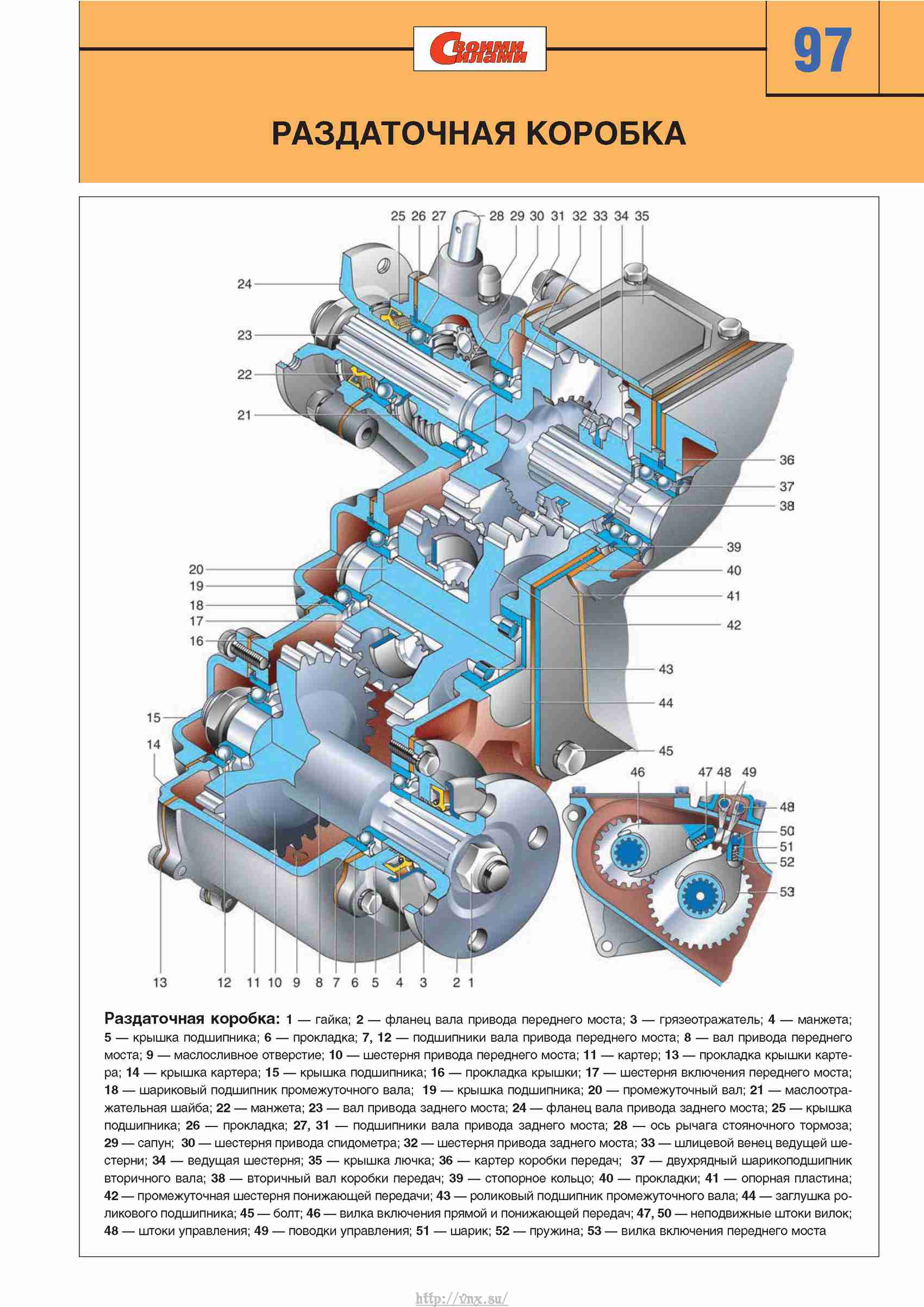 Общая схема работы косозубой раздаточной коробки Уаз.
