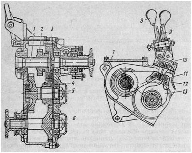 Механизм состоит из двух штоков и двух вилок, расположенных в крышке картера раздаточной коробки. Вилки скользят по неподвижным штокам и снабжены шариковыми фиксаторами. В автомобилях с четырех и пятиступенчатой коробкой передач сам рычаг управления переключением раздатки и его рукоять отличаются.