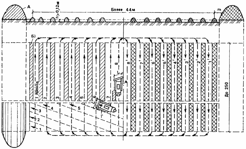 Гребенчатую схему применяют при разработке тяжелых плотных грунтов. Отвал сначала максимально заглубляют в грунт. Когда число оборотов двигателя начинает снижаться, отвал поднимают примерно на 3Д глубины. Такие заглубления и подъемы повторяют 2—3 раза. Во время этих операций происходит полный набор грунта на отвал бульдозера. Работая по этой схеме, добиваются почти 100%’ использования мощности трактора, время набора уменьшается по сравнению с прямоугольной схемой, уменьшается также и путь формирования призмы волочения, но машинист быстро утомляется из-за большого числа переключений рычагов управления. Применение всех схем рационально на грунтах оптимальной влажности.