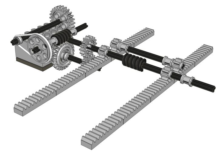 Этот приводной вал приводится в действие высокоскоростным двигателем, обычно установленным в отдельном машинном отделении, для подъема легкового автомобиля. Лифты с реечной передачей работают по-другому, поскольку в них нет подъемных канатов или тросов. Приводной двигатель прикреплен к верхней части автомобиля, а ведущая шестерня, называемая шестерней, прикреплена к двигателю. Это позволило установить постоянно установленную зубчатую рейку, создав систему лифта без проскальзывания для использования в суровых условиях, например, на строительной площадке под открытым небом.