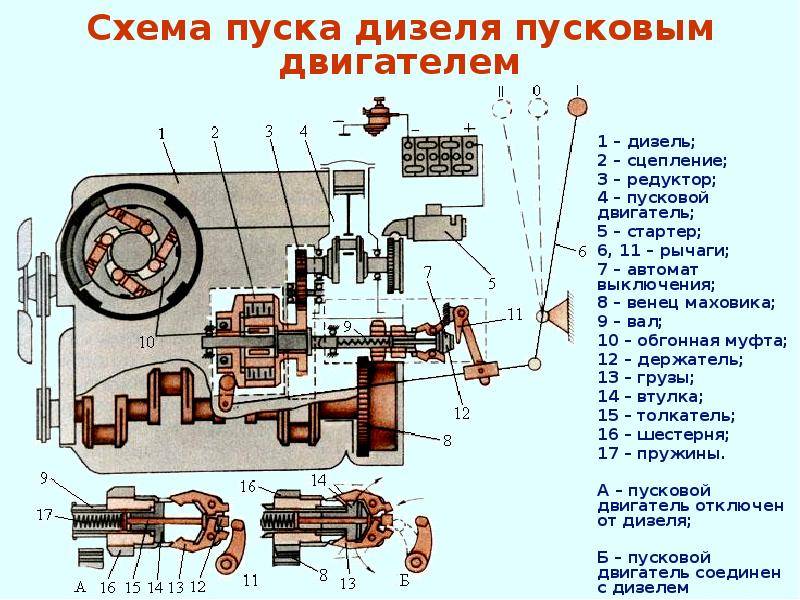 Система запуска, устанавливаемая на бензиновые и дизельные двигатели, имеет аналогичную конструкцию. Для облегчения запуска дизельных двигателей в холодное время система запуска может оборудоваться свечами накаливания, которые подогревают воздух во впускном коллекторе.