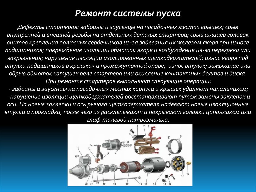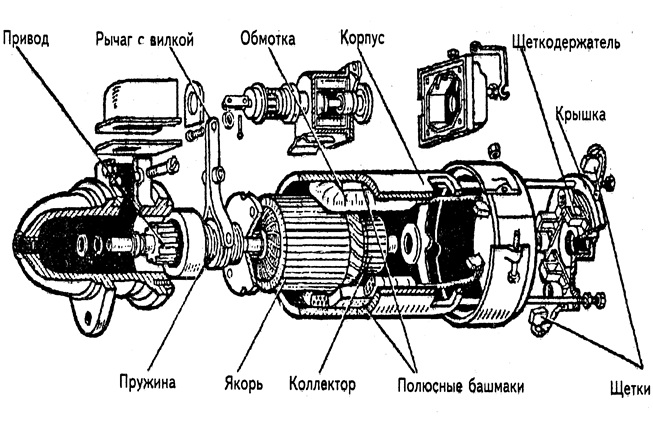 Стартер создает необходимый крутящий момент для вращения коленчатого вала двигателя. Он представляет собой электродвигатель постоянного тока. Конструктивно стартер состоит из статора (корпуса), ротора (якоря), щеток со щеткодержателем, тягового реле и механизма привода.