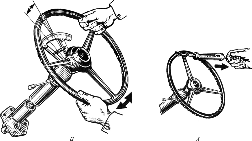 Рулевой механизм не нуждается в регулировке в том случае, если свободный ход рулевого колеса при движении по прямой не превышает 25 мм (около 8°) при измерении его на ободе.