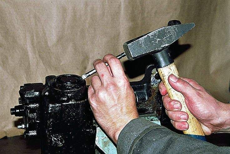 - Во избежание повреждения резьбы на пальце необходимо предварительно ударить несколько раз молотком по боковой поверхности головки сошки или сдвинуть палец с места специальным съемником. После этого, сохраняя положение сошки, соответствующее движению по прямой, и покачивая сошку за головку, определяют величину бокового зазора в зацеплении. В пределах поворота червяка на угол около 60° от среднего положения (3°32′ поворота сошки) вправо и влево зазора в зацеплении не должно быть.