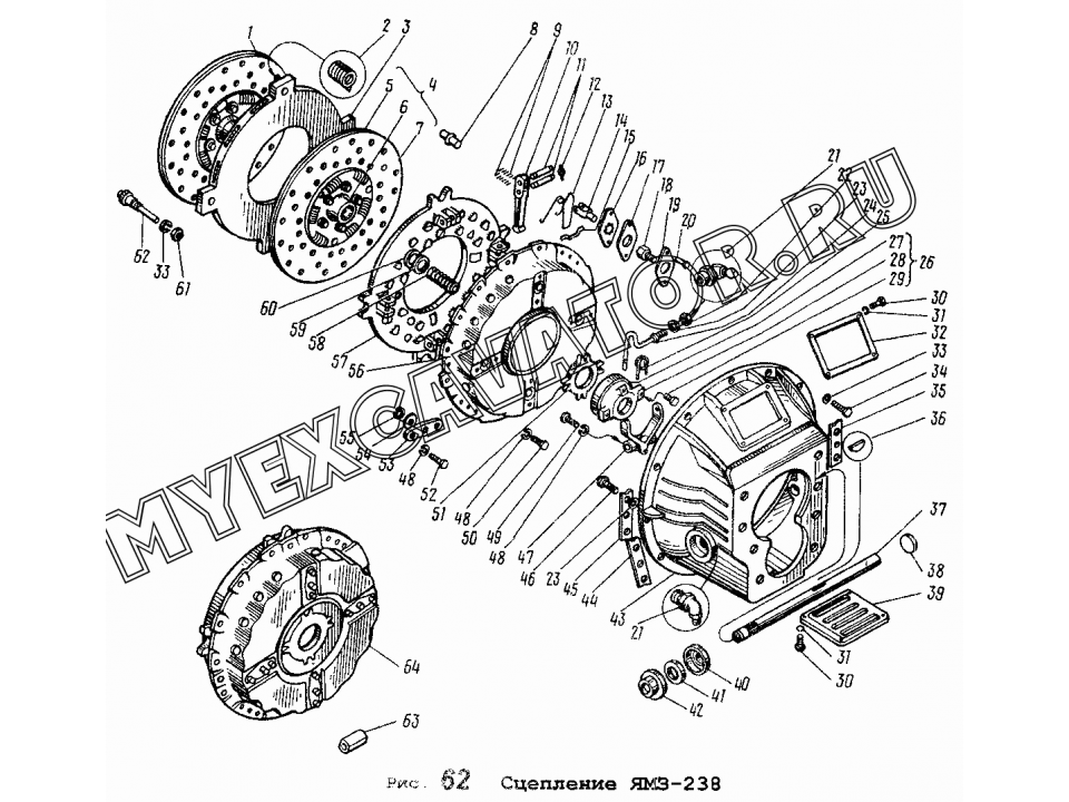 Сцепление МАЗ однодисковое включает: ступицы, диск и вилку сцепления, прокладки, маховик, пружины, отжимной и рычаг вала, шток, гайку, кожух, палец, муфты, кольца, пластины.