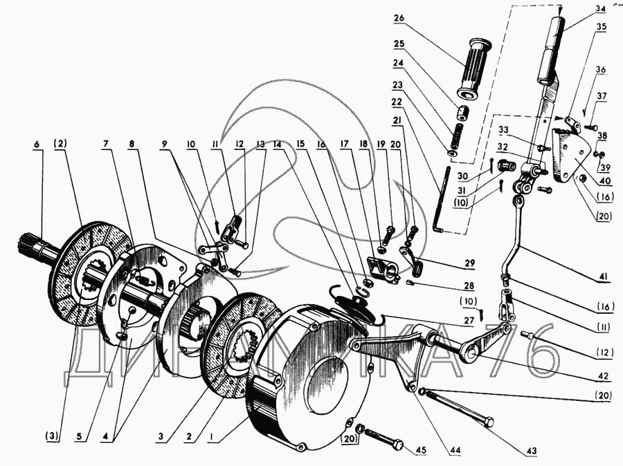 1 – диск, 2 – крепежный валик, 3 – тормозная педаль, 4 – рычаг тормоза, 5 – кожух, 6 – нажимные диски.