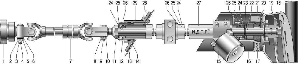 Рис. 5.2. Рулевой механизм: 1 – шестерня; 2 – подшипник; 3 – кольцо упорное; 4 – гайка подшипника; 5 – манжета шестерни; 6 – защитный колпачок; 7 – гайка упора; 8 – контргайка упора; 9 – пружина упора; 10 – упор рейки; 11 – подшипник шестерни передний; 12 – втулка рейки с кольцом; 13 – картер рулевого механизма; 14 – рейка; 15 – кольцо упорное втулки; 16 – хомут крепления чехла; 17 – чехол рейки; 18 – шайба стопорная; 19 – наконечник внутренний; 20 – кольцо упорное; 21 – вкладыш наружный; 22 – вкладыш внутренний; 23 – кольцо крепления чехла; 24 – тяга шаровая; 25 – гайка наружного наконечника; 26 – наконечник тяги наружный; 27 – шплинт; 28 – палец шаровой наконечника; 29 – кольцо уплотнительное; 30 – чехол защитный; 31 – вкладыш нижний; 32 – пружина вкладыша; 33 – заглушка; 34 – кольцо пружинное; 35, 38 – гайки; 36 – винт хомута чехла рейки; 37 – гайка хомута; 39 – болт крепления картера к поперечине