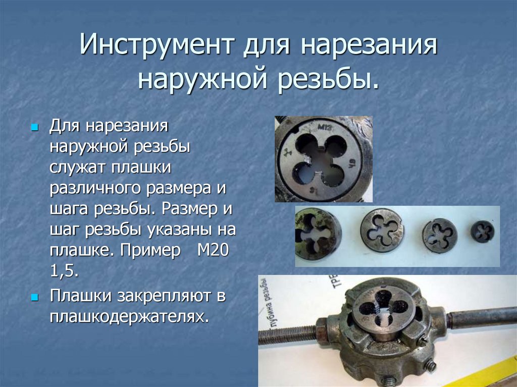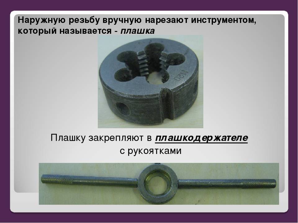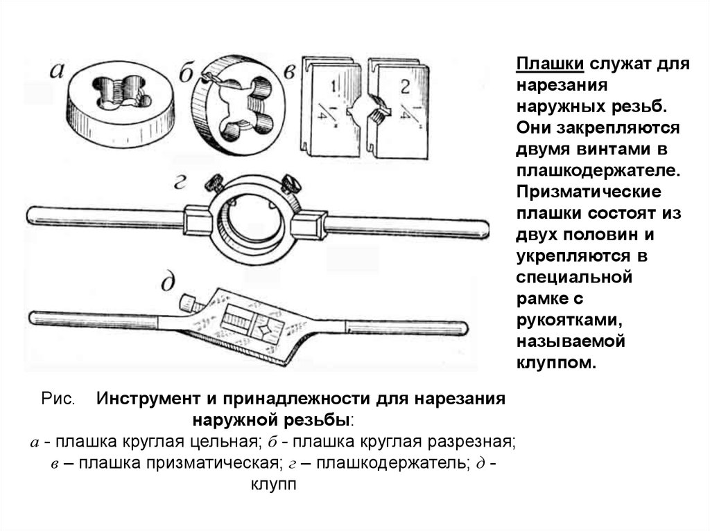 Для нарезания наружной резьбы потребуются следующие инструменты и материалы: плашка или трубный клупп, плашкодержатель, напильник, тиски, штангенциркуль, машинное масло.