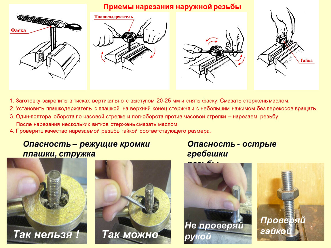 Плашку накладывают на конец стержня так, чтобы её плоскость была перпендикулярна оси нарезаемого болта. Далее с небольшим нажимом вращают плашкодержатель по часовой стрелке (если резьба левая, то против часовой стрелки). Когда плашка врежется в стержень на одну-две нитки, её следует повернуть на пол-оборота назад для лучшего удаления стружки. После этого снова делают 1-2 оборота по ходу резьбы и 0,5 – в обратную сторону. Действуя по данной схеме, болт нарезают на необходимую длину.