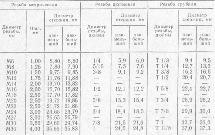 Толщину стержня выбирают на 0,1…0,25 мм меньше диаметра наружной резьбы. Например, для М6 с крупным шагом это 5,80…5,90 мм; М8 – 7,80…7,90 мм; М10 – 9,75…9,85 мм. Замеры выполняют с помощью штангенциркуля. Диаметры стержней под нарезание метрической резьбы среднего класса точности 6g представлены в таблице.
