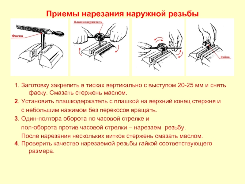 Чтобы обеспечить лучшее врезание плашки, на конце стержня запиливают фаску. Её ширина должна быть 1 – 1,5 мм для М6 … М18. Заготовку смазывают машинным маслом, что облегчает последующую работу и позволяет получить более качественную поверхность.