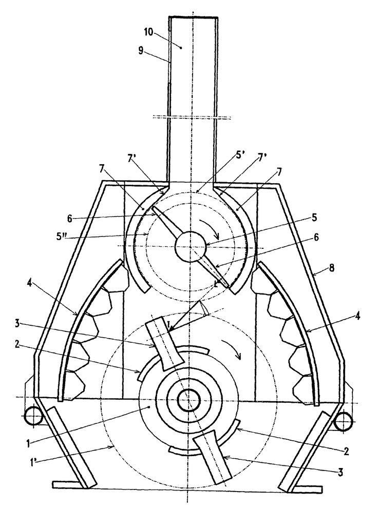 Машина для дробления на средние и мелкие фракции шлака металлургического, известняка, доломита, мергеля, мрамора, гипса, руд малой абразивности и других подобных материалов, предел прочности которых не превышает 600 кгс/см2, а размер кусков 300 мм.