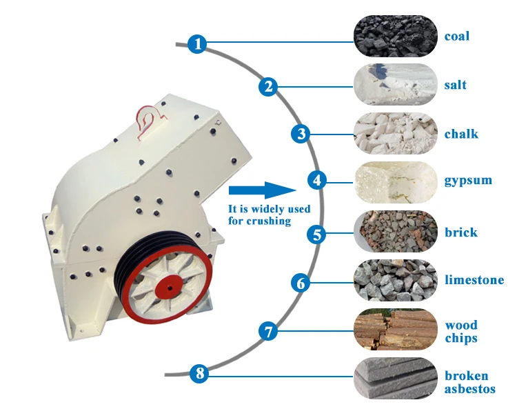 д. Основное применение молотковой дробилки в Китае. Китай Молотковая дробилка или молотковая дробилка в основном используется для дробления среднетвердых или хрупких материалов с твердостью не более 100 МПа и влажностью в пределах 15%, таких как уголь, соль, мел, гипс,