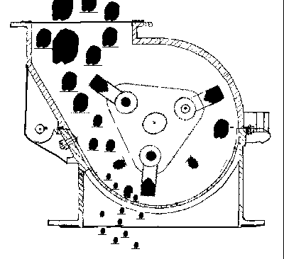Молотковые дробилки, или молотковые мельницы, дробят материал ударами молотов, шарнирно закрепленных на быстровращающемся роторе (конечная скорость молотков до 55 м/сек), и куски материала также разбиваются ударами о пластины мельницы.