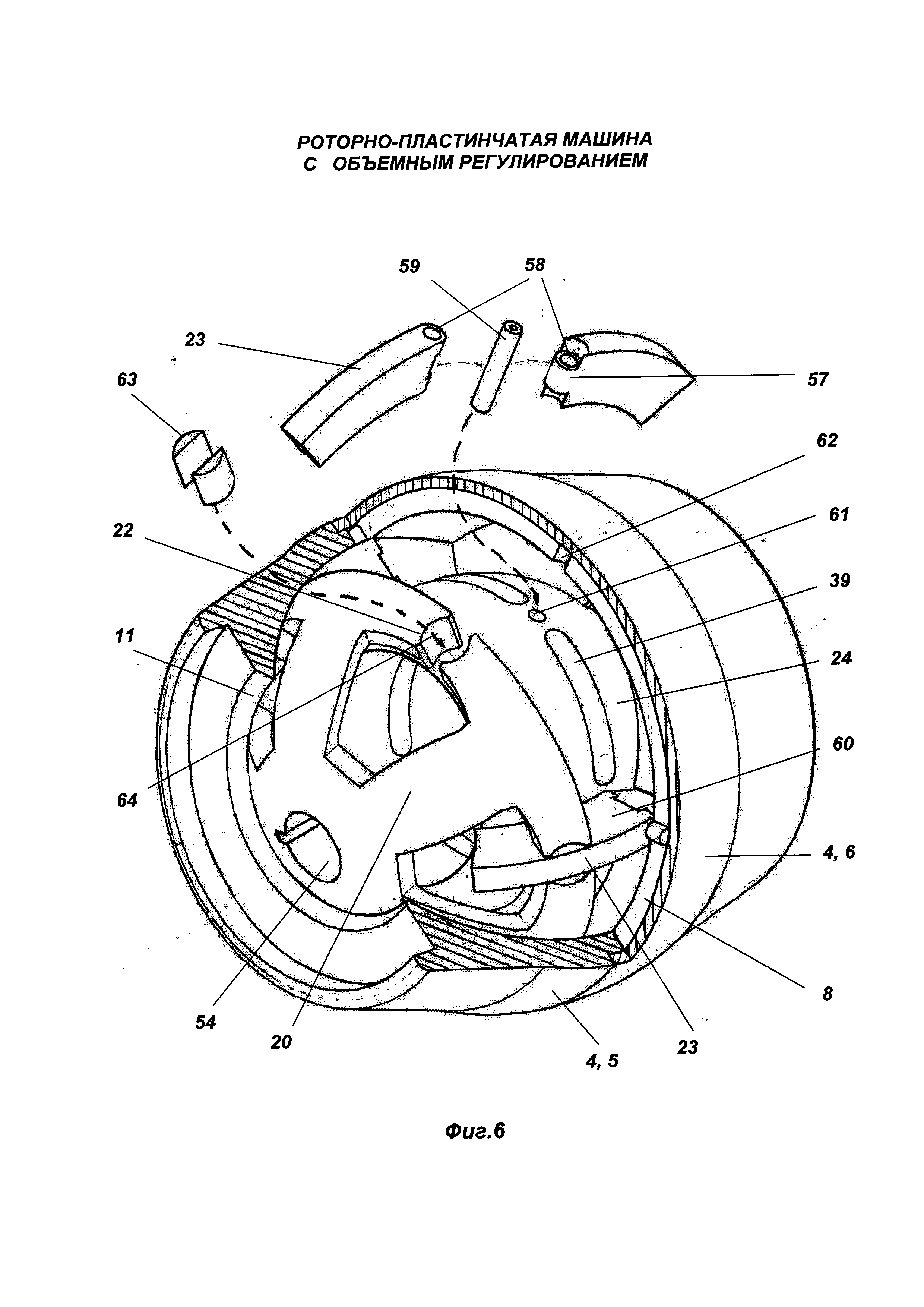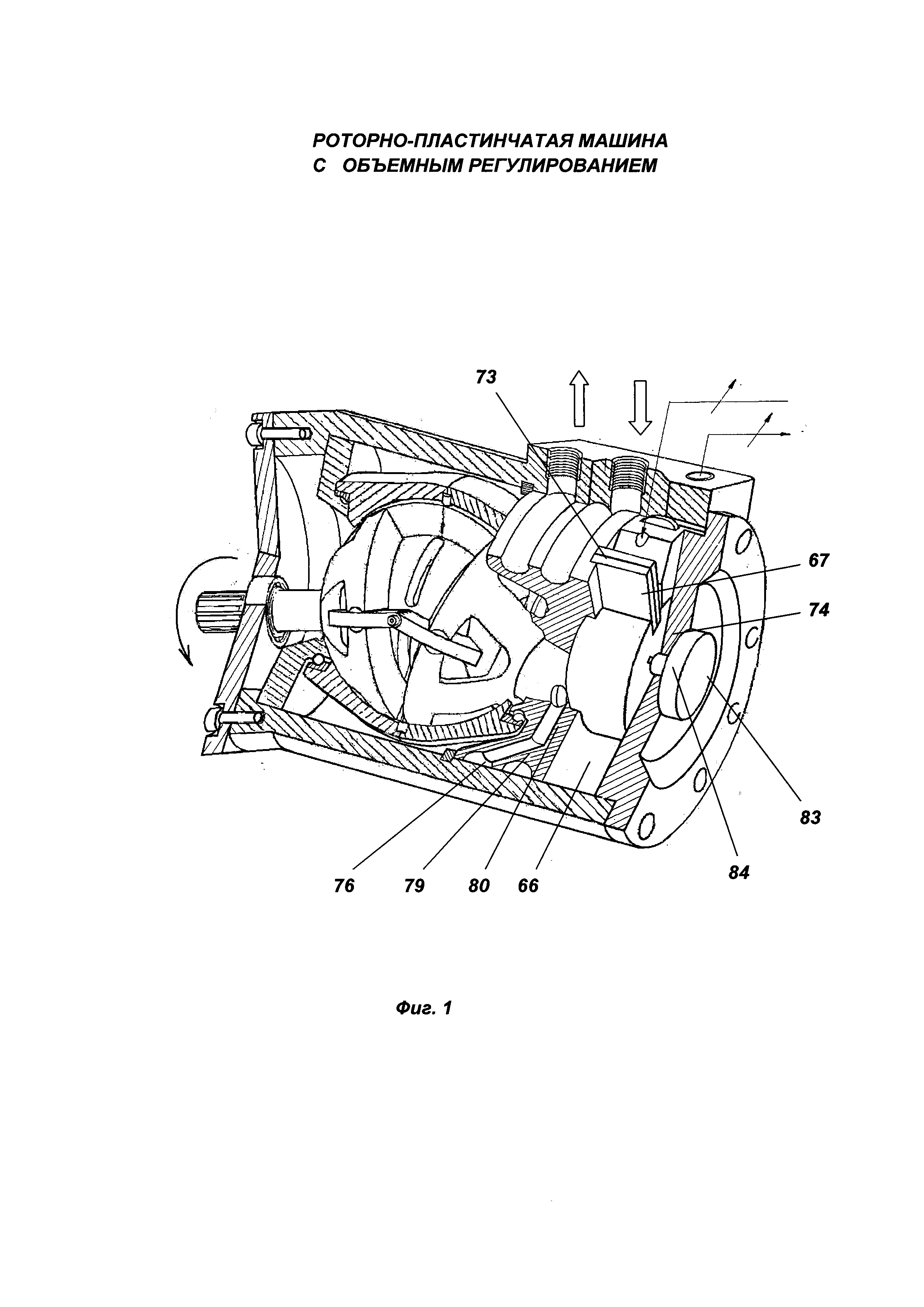 1. Роторно-пластинчатая машина, содержащая неподвижный корпус с внутренней цилиндрической расточкой и окнами подвода и отвода рабочей среды, сообщенными с напорной и сливной магистралями, соответственно, полый цилиндрический ротор с приводом и продольными радиальными профилированными пазами с противолежащими вогнутыми дугообразными поверхностями, эксцентрично размещенный в расточке корпуса, установленные во вкладышах, имеющих плосковыпуклую форму, разделительные пластины, имеющие рабочие и торцевые поверхности, с проушинами, охватывающими ось, совпадающую с осью расточки корпуса, причем вкладыши размещены с возможностью поворота в продольных радиальных профилированных пазах ротора за счет взаимодействия своей внешней выпуклой поверхностью с их противолежащими вогнутыми дугообразными поверхностями, отличающаяся тем, что в каждой разделительной пластине выполнены сообщающиеся между собой и соединенные с внутренней полостью ротора каналы в виде проточек по боковым торцевым ее поверхностям и по торцевой поверхности, взаимодействующей с внутренней поверхностью внутренней цилиндрической расточки неподвижного корпуса, при этом, по крайней мере, торцевая поверхность каждой разделительной пластины с каналом в виде проточки, взаимодействующая с внутренней поверхностью внутренней цилиндрической расточки неподвижного корпуса, и ее боковые торцевые поверхности, на которых также выполнены каналы в виде проточек, рабочие поверхности каждой разделительной пластины, а также поверхности трения вкладышей, взаимодействующие с рабочими поверхностями разделительной пластины и противолежащими вогнутыми дугообразными поверхностями продольных радиальных профилированных пазов ротора, выполнены с керамическим покрытием.