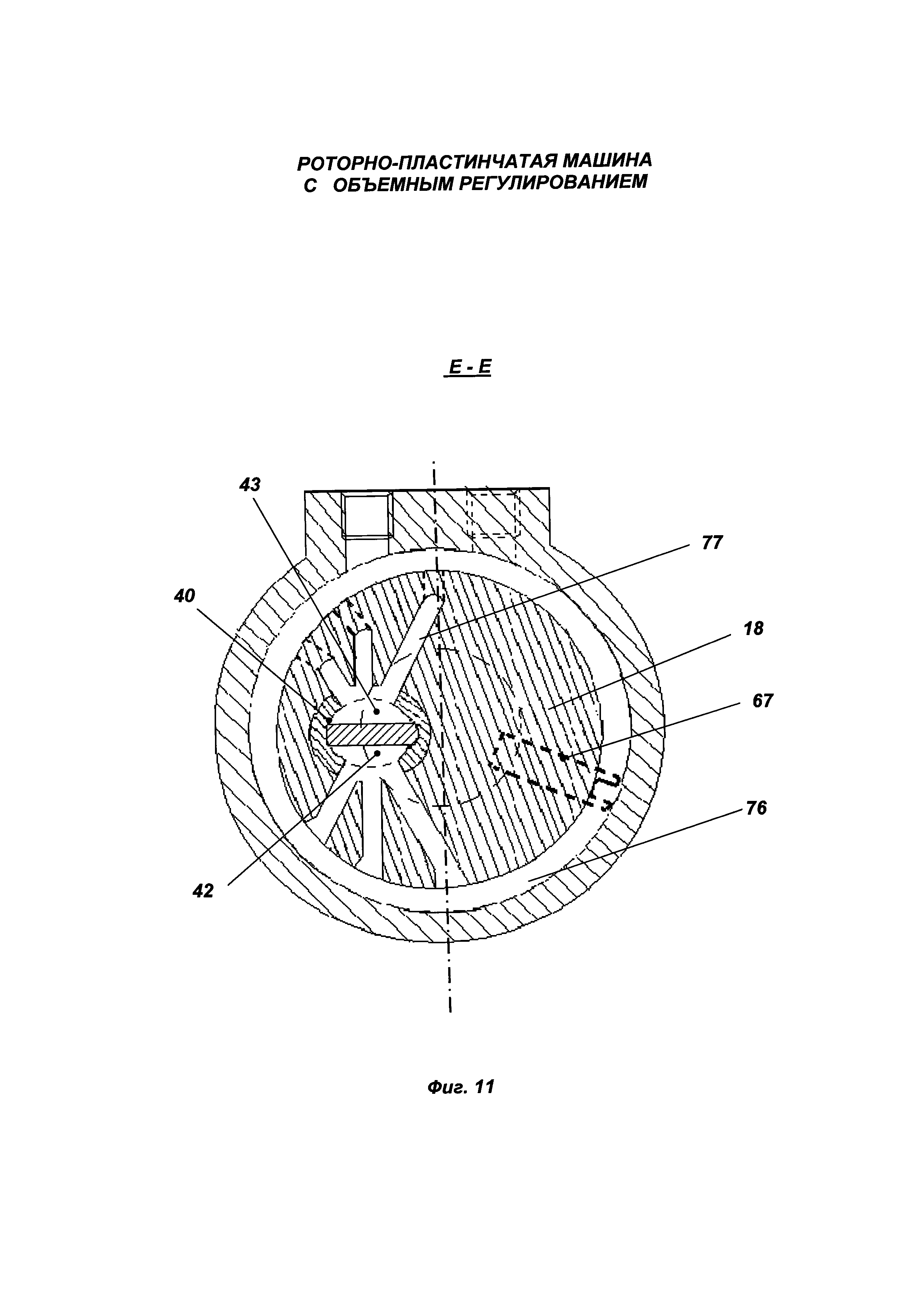 Роторно-пластинчатая машина во всех трех вариантах выполнения изобретения имеет цилиндрический корпус 1 с внутренней цилиндрической расточкой 2 и окнами подвода 3 и отвода 4 рабочей среды, сообщенными с напорной и сливной (не показано) магистралями. Полый цилиндрический ротор 5 эксцентрично размещен в расточке 2 корпуса 1, имеет привод (не показано) и продольные радиальные профилированные пазы 6 с противолежащими вогнутыми дугообразными поверхностями 7. Разделительные пластины 8, имеющие рабочие 9 и торцевые 10 и 11 поверхности, с проушинами 12, охватывающими ось, совпадающую с осью (не показаны) расточки 2 корпуса 1, установлены во вкладышах 13, имеющих плосковыпуклую форму.