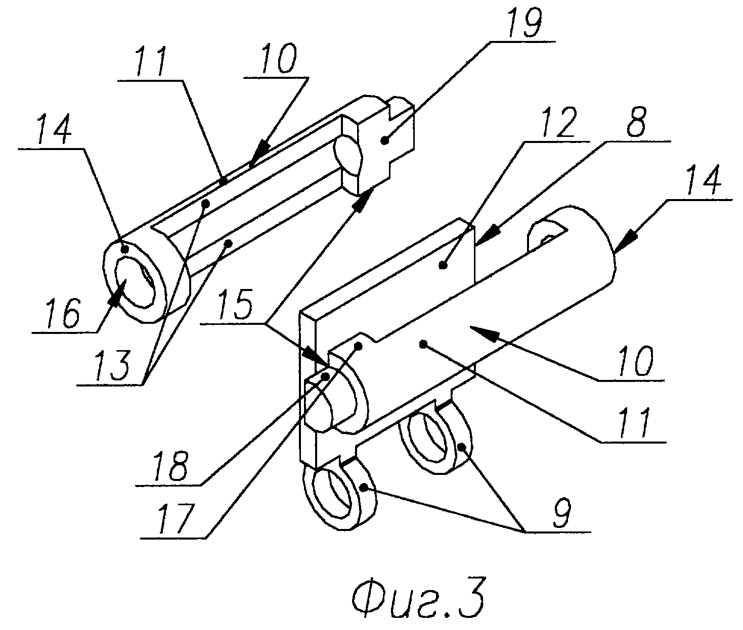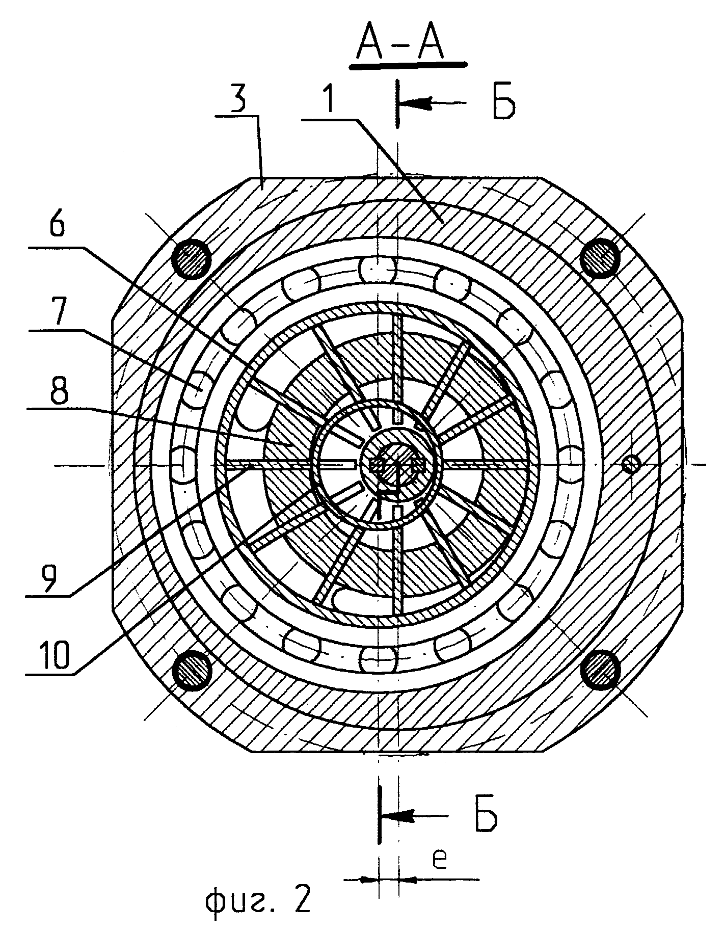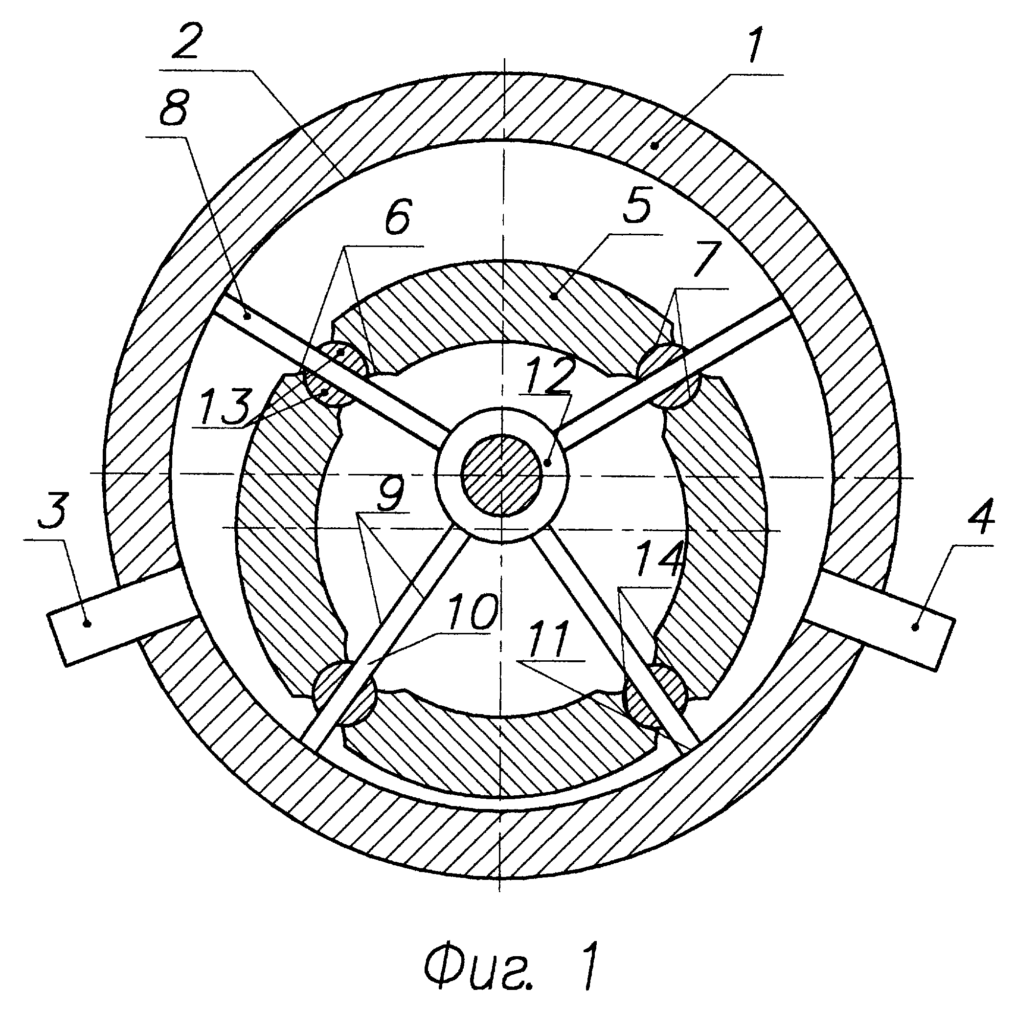 Разделительные пластины 8 совершают во вкладышах 13 знакопеременные движения за счет того, что они установлены эксцентрично в расточке 2 корпуса 1 через проушины 12. Сами вкладыши 13 скользят вращательным движением в продольных радиальных профилированных пазах 6 за счет взаимодействия своей внешней выпуклой поверхностью 14 с противолежащими вогнутыми дугообразными поверхностями 7 ротора 5.