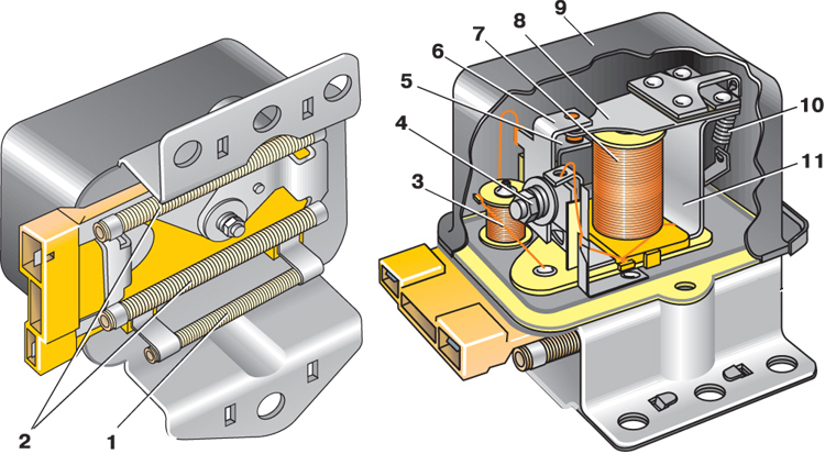 состоит из ярма, стального сердечника с обмоткой, якоря и стойки с неподвижным