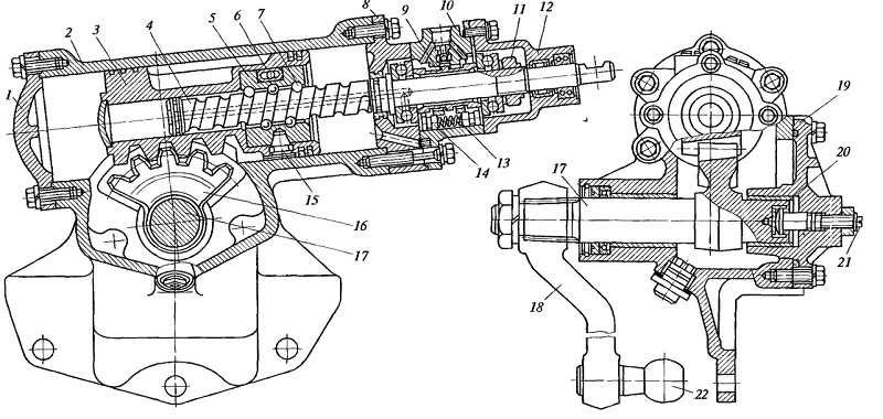 Их достоинством являются малые потери на трение и длительный срок службы. В данном случае вращение рулевого вала через шарики преобразуется в продольное перемещение гайки, которая за счет зубчатого зацепления на своей внешней стороне с зубчатым сектором вызывает поворот вала сошки.