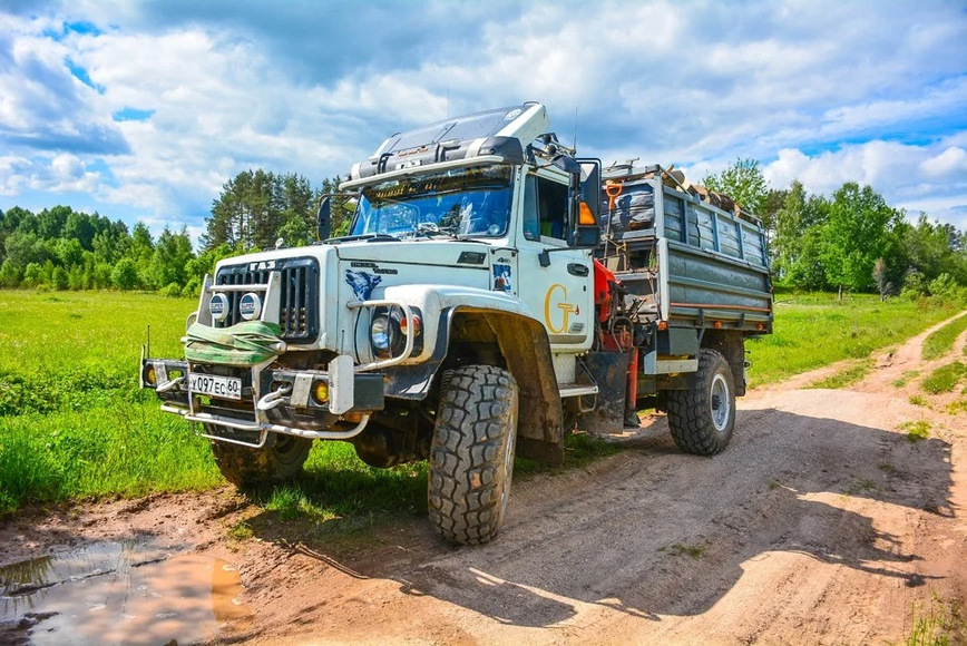 с. С двигателем сопряжена пятиступенчатая механическая коробка передач с однодисковым сухим сцеплением, оснащенным гидроприводом. После коробки передач крутящий момент передается на раздаточную коробку, откуда через необслуживаемые карданные валы поступает на оба моста. Обновленный грузовик в полноприводной конфигурации способен перевозить до 3 т груза.