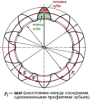 Для пары зацепляющихся зубчатых колес окружной шаг зубьев должен быть одинаковым.