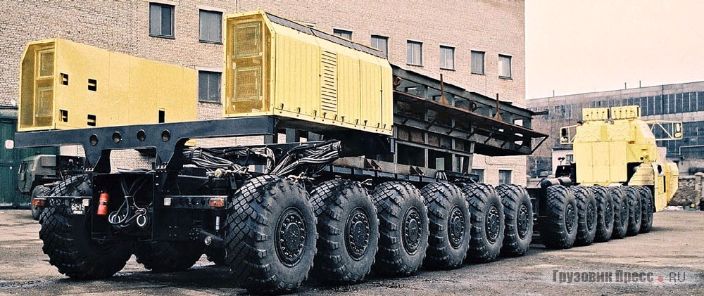 с., а в качестве вспомогательного мотора – 330-сильный ЯМЗ-238. В Байконур, где решили проводить испытания МАЗ-7904, автомобиль доставляли в разобранном виде. Тем не менее для его транспортировки по железной дороге пришлось изготовить на Уралвагонзаводе уникальную 12-осную платформу общей грузоподъемностью 120 т!