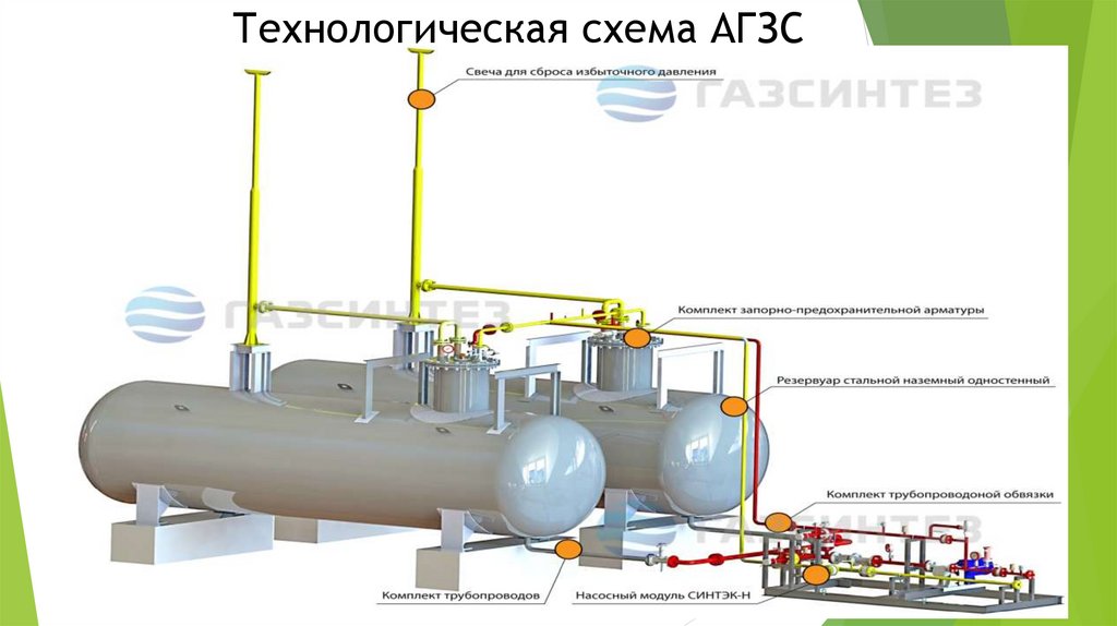 Конструктивно системы АГЗС состоят из сосудов для хранения сжиженного газа, насосного блока с трубопроводами обвязки, газораздаточных колонок, систем противоаварийной безопасности и управления.