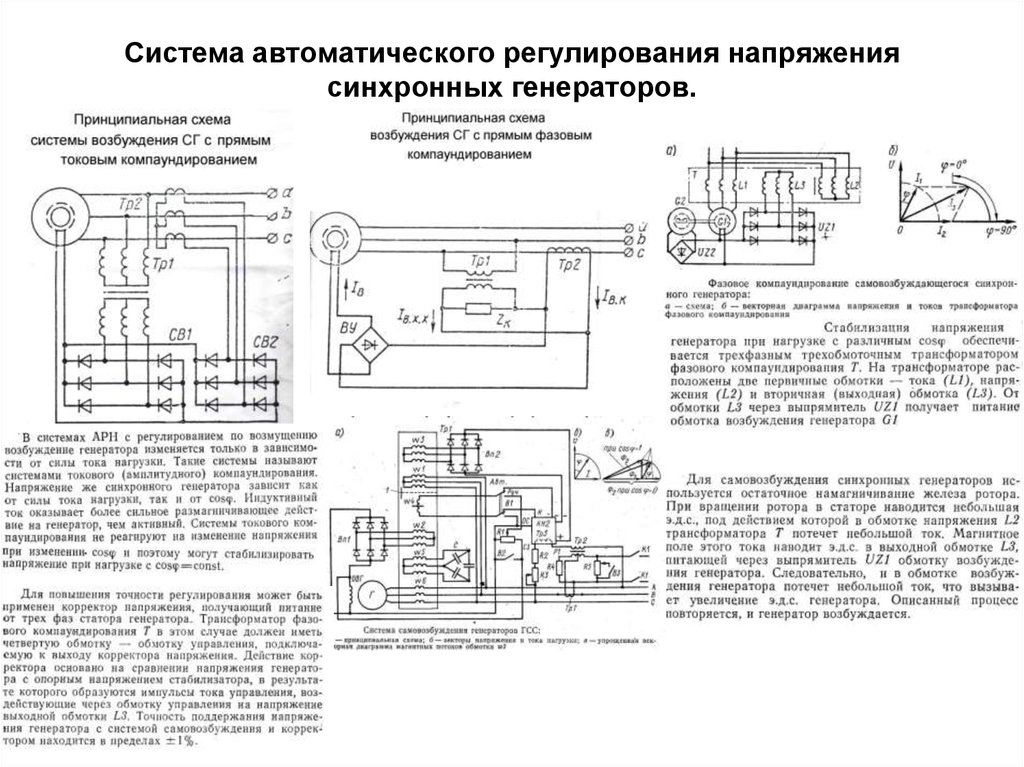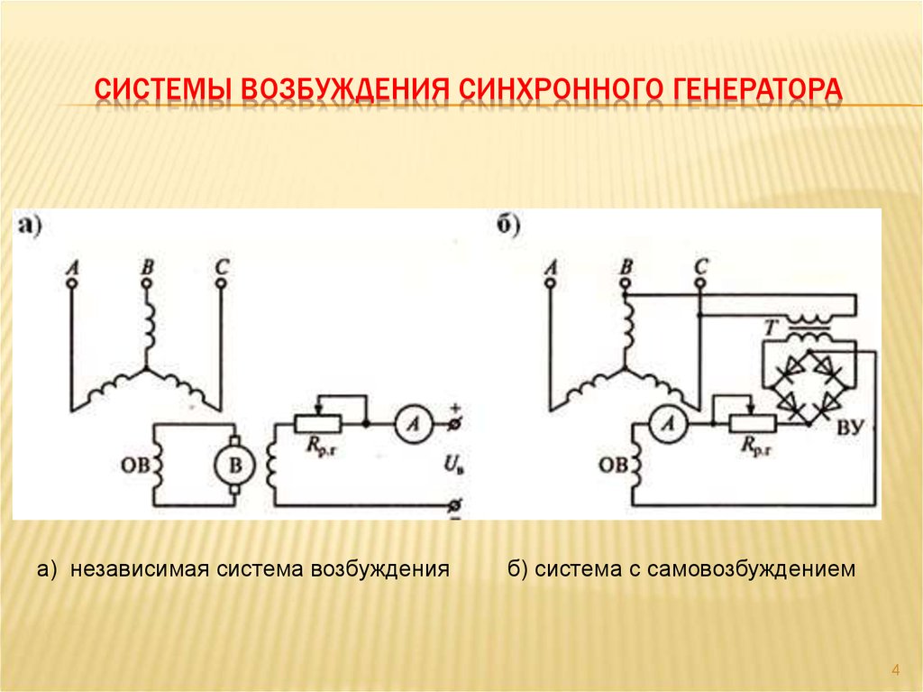 Ток возбуждения синхронного генератора регулируется реостатом R (см. рис. 199), который включен последовательно с обмоткой возбуждения ОВ.
