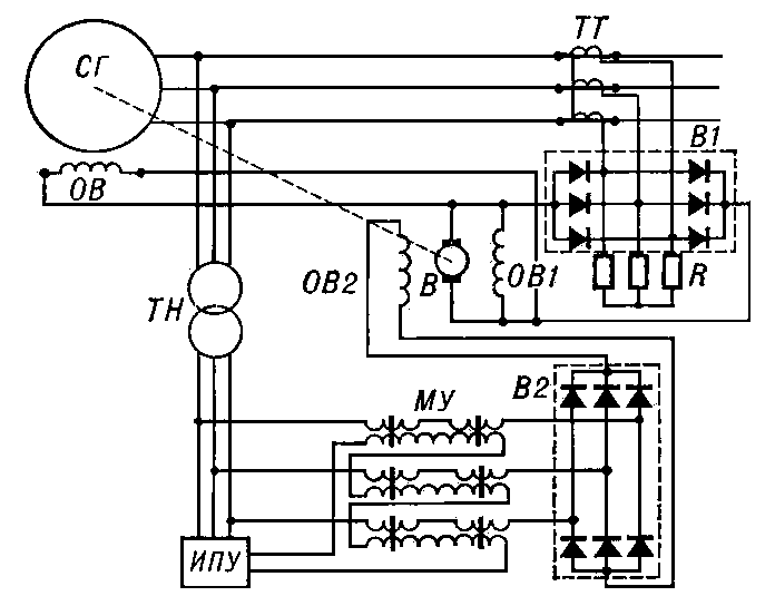 Дизель-генераторы снабжены аппаратурой системы самовозбуждения и автоматического регулирования напряжения (рис. 198). Последовательно с нагрузкой включены первичные обмотки трансформатора 77, а параллельно нагрузке-первичные обмотки трансформатора Т2. Вторичные обмотки этих трансформаторов соединены параллельно и питают выпрямитель В, к которому подключена обмотка возбуждения ОВ синхронного генератора. Вторичный ток /; последовательного трансформатора зависит от тока нагрузки I, вторичный ток 1и параллельного трансформатора — от напряжения нагрузки и. Ток на входе выпрямителя равен геометрической сумме токов и 1и, т. е. I —= /; +