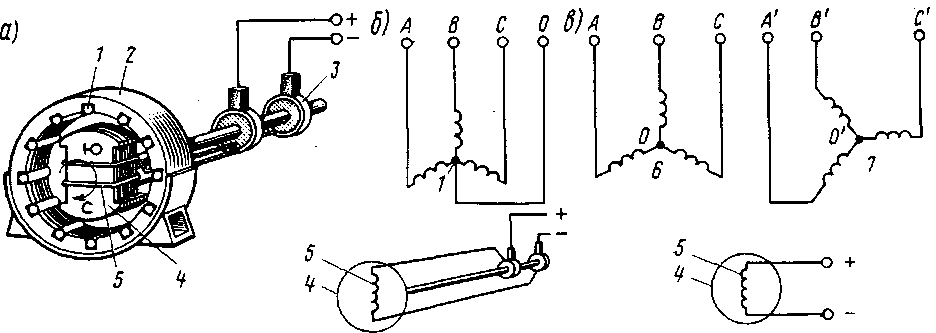 Синхронный генератор состоит из неподвижного статора 2 (рис. 196, а), на котором размещаются три обмотки (Л X, В У. С Т), и вращающегося ротора 1 с полюсами, на которых находится обмотка возбуждения ОВ. Постоянный гок, поступающий в обмотк\ возбуждения, намагничивает ротор, а первичный двигатель вращает его с частотой п. При этом обмотки статора пересекаются магнитным полем и в них индуцируются переменные э. д. с., сдвинутые по фазе на угол 120 Источником постоянного тока возбуждения /„ является возбудитель небольшой генератор постоянного тока, мощность которого составляет 2 -3% мощности грехфазного генератора. Якорь генератора постоянного тока соединен с валом синхронного генератора и приводится во вращение общим первичным двигателем.