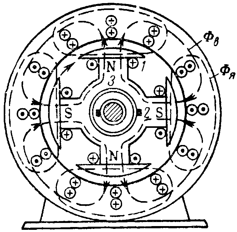 В результате размагничивания ротора снижается э. д. с. и напряжение генератора. Если к генератору подключить только активную нагрузку, то магнитный поток статора будет сдвинут относительно ротора на угол 90°. Размагничивающее действие реакции статора несколько снижается и напряжение генератора изменяется по кривой 2. При нагрузке с преобладанием емкости магнитный поток статора направлен в одну сторону с магнитным потоком ротора. Поэтому напряжение генератора изменяется по кривой 3.