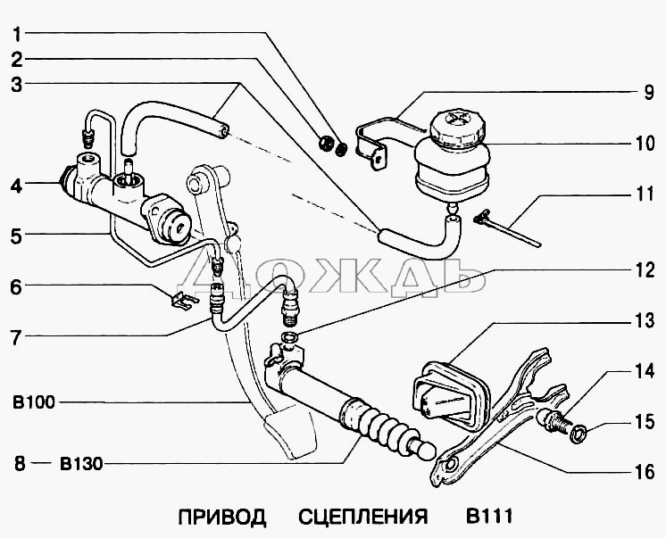 Схема механического привода сцепления: 1 — контргайка; 2 — регулировочная гайка; 3 — нижний наконечник троса; 4 — защитный чехол троса; 5 — кронштейн крепления троса; 6 — нижний наконечник оболочки троса; 7 — оболочка троса; 8 — поводок троса; 9 — уплотнитель; 10 — верхний наконечник оболочки троса; 11 — верхний наконечник троса; 12 — кронштейн педали сцепления; 13 — пружина педали сцепления; 14 — педаль сцепления; 15 — упорная пластина.