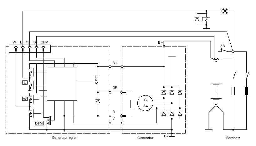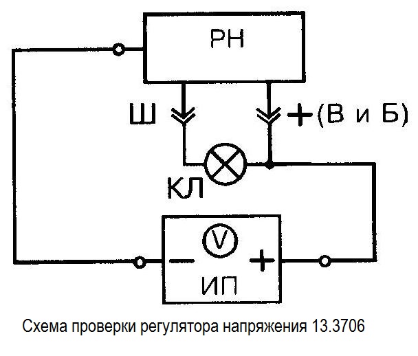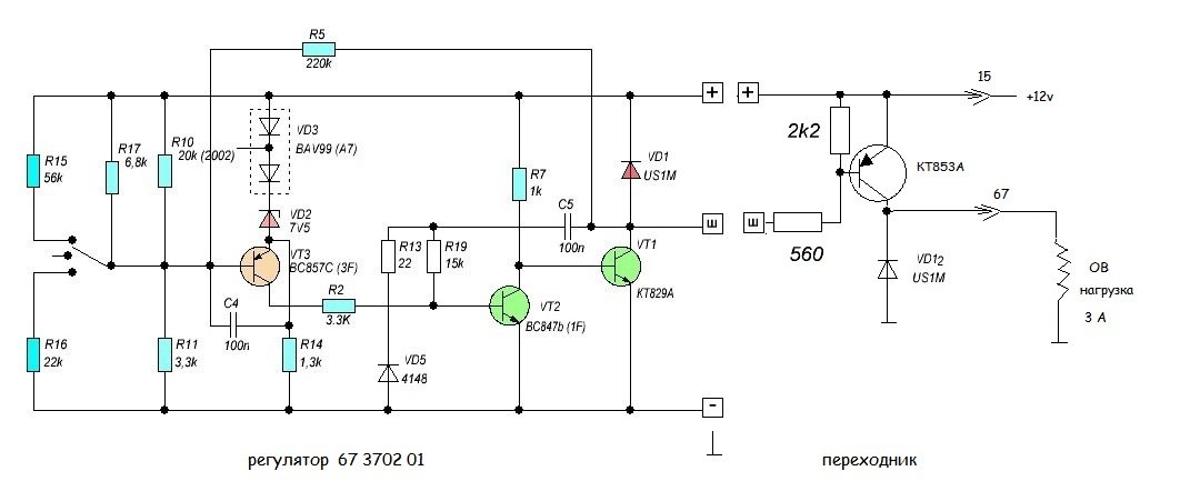 Точка В регулятора всегда соединена с выходом генератора и аккумулятора. Пока на точке Б нет плюса, Составной транзистор V4 V5 закрыт и ток возбуждения идти не может, это защищает аккумулятор от разрядки при выключенном двигателе. При включении зажигания, плюс приходит на точку Б. По резистору R6 возникает положительное смещение на базе составного транзистора, появляется ток базы и транзистор V4 V5 открывается. Транзистор V2 закрывается и плюс на его коллекторе поддерживает открытый режим транзистора V4 V5, появляется ток возбуждения (точка В, Обмотка возбуждения, точка Ш транзистор V5, масса). Генератор возбуждается и напряжение повышается. Транзистор V2 закрыт, потому, что цепь его базы не проводит тока потому, что стабилитрон закрыт. Выходное напряжение генератора приложено к делителю R1R2, часть этого напряжения действует на стабилитроне V1. Напряжение повышается до напряжения стабилизации и стабилитрон открывается, появляется ток R1, V1, база транзистора V2, и транзистор открывается. Потенциал его коллектора заземляется, диод V3 мгновенно закрывается, и ток базы выходного составного транзистора обрывается, он закрывается, и ток возбуждения генератора прекращается, напряжение генератора начинает падать. Когда на стабилитроне V1 напряжение станет меньше напряжения стабилизации, стабилитрон закроется, прекратится ток базы транзистора V2, и он закроется, на его коллекторе появится плюс, который откроет диод V3, появится ток базы транзистора V4 V5 и он откроется, появится ток возбуждения, и напряжение начнет расти. Далее все повторится. Цепочка Rк С2 обеспечивает обратную связь, по которой проходит импульс, обеспечивающий четкое срабатывание всей схемы. Регулятор все время работает в режиме переключения, в момент, когда стабилитрон открывается, транзистор V2 начинает открываться и закрывает составной транзистор, на коллекторе V4 появляется плюс, который скачком через конденсатор попадет на базу V2, и ускоряет его открытие, это ускоряет закрытие составного транзистора. Конденсатор С1 работает как фильтр, поддерживая независимость работы стабилитрона от скачков напряжения, связанных с работой самого регулятора.